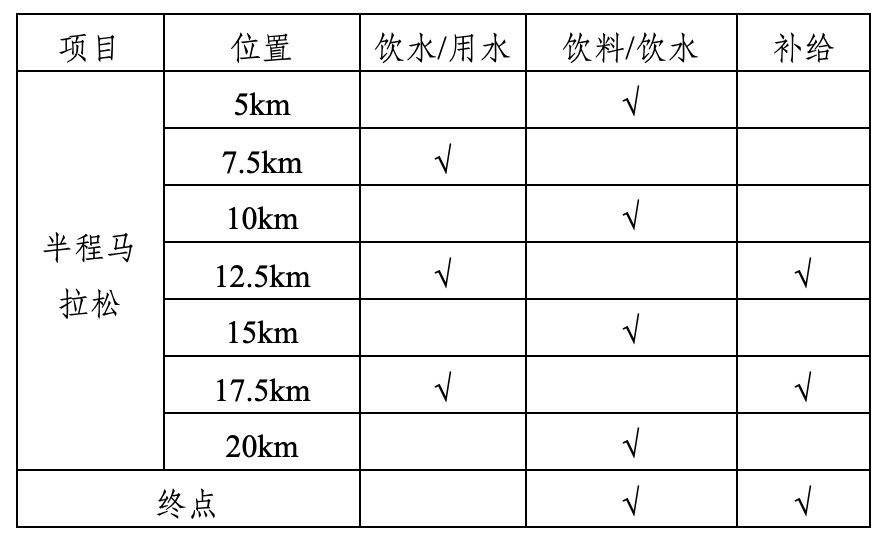 1.饮料、饮水/用水站:半程马拉松自起点开始大约每5公里的间隔距离设置一个饮料/饮水站,两个饮料/饮水站中间设置饮水/用水站。
