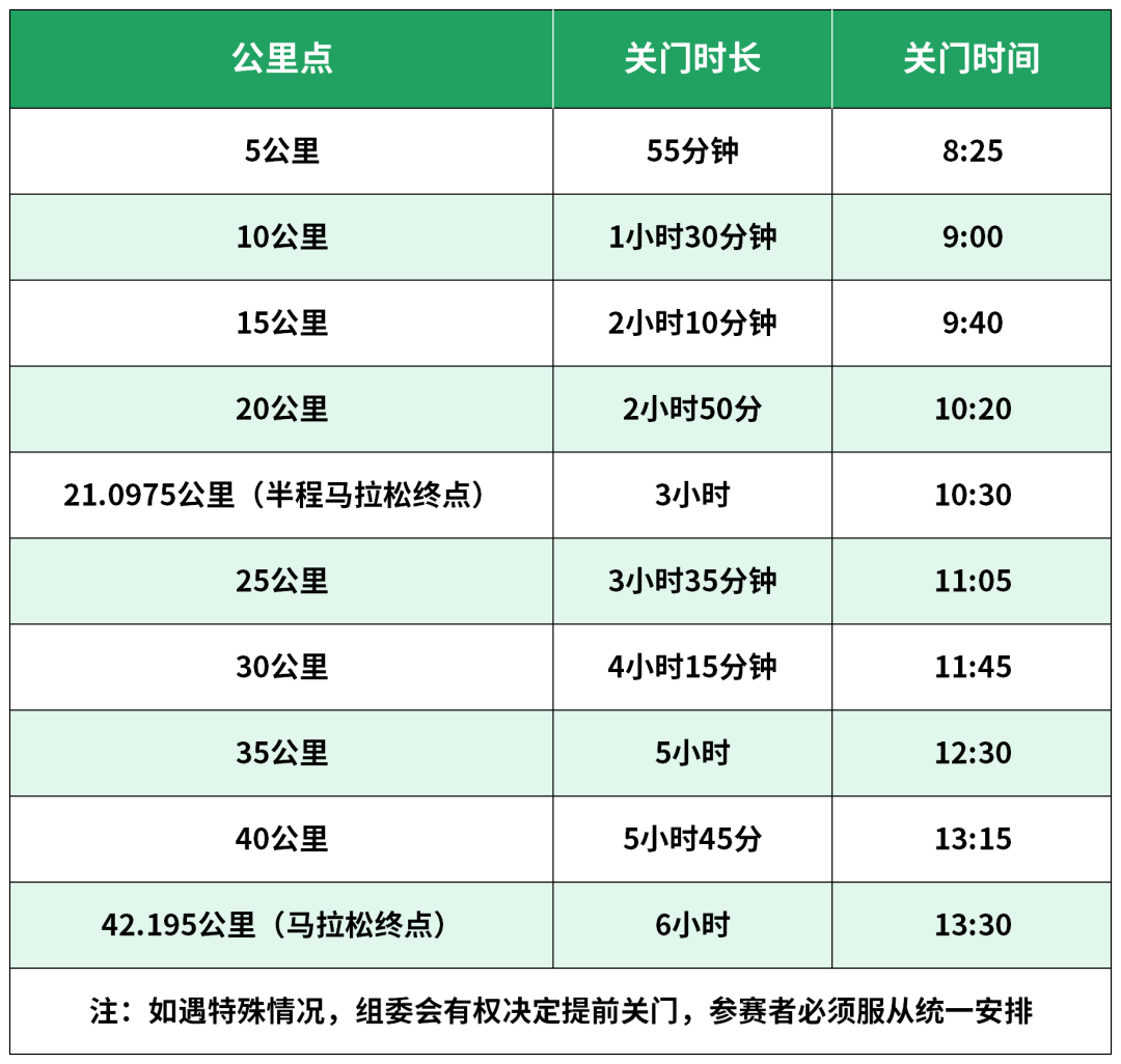 为保证运动员比赛安全和城市道路交通秩序,各公里点关门后,比赛计时感应地毯立即停止工作,赛道解除交通管制并恢复正常交通,运动员应及时停止比赛退出赛道,等候组委会援助车抵达终点。否则由此引发的事故将由该名运动员自行承担相应法律责任和赔偿责任。各项目分段关门时间见下表:
