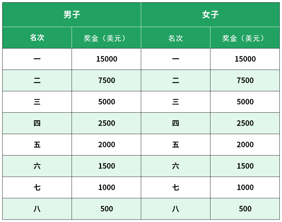 (五)上述所有奖项均为个人赛奖励,奖金需征收20%的个人所得税。另外,根据世界田联标牌路跑赛事规则,马拉松项目前8名奖金中的2%将作为“运动员贡献费金”由赛事组委会代扣代缴。