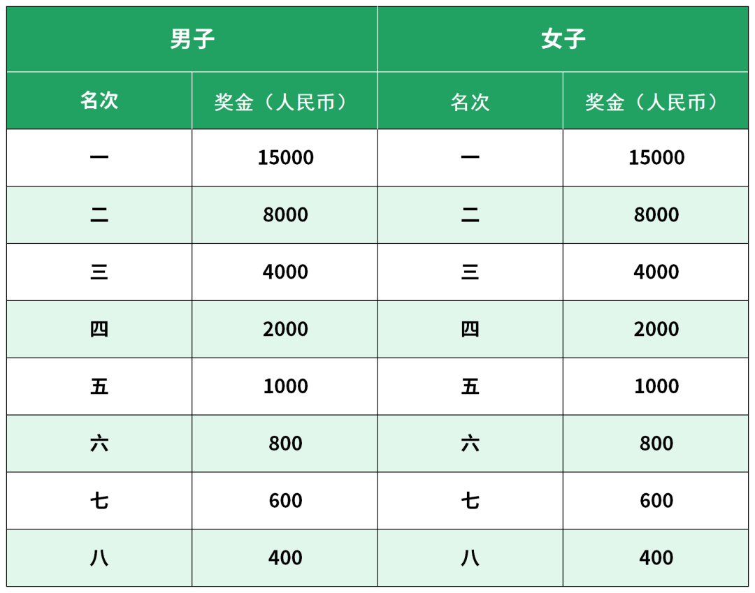 女子马拉松:2:32:30以内(不含2:32:30)且第一名,奖励人民币10000元。